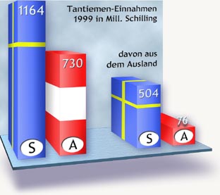 Vergleichen wir die Einkommen von Musikschaffenden und -verlegern, so erzielten die bei der AKM Bezugsberechtigten 1999 Einnahmen in der Höhe von runden 431 Millionen und 243 Millionen aus Austro-Mechana Lizenzen. Dazu kommen 56 Mio. Schilling für Interpretenrechte von der LSG. Diesen insgesamt 730 Mio. Schilling stehen 771 Mio. Kronen gegenüber, umgerechnet 1164 Mio. Schilling, die in Schweden zur Verteilung gelangten.